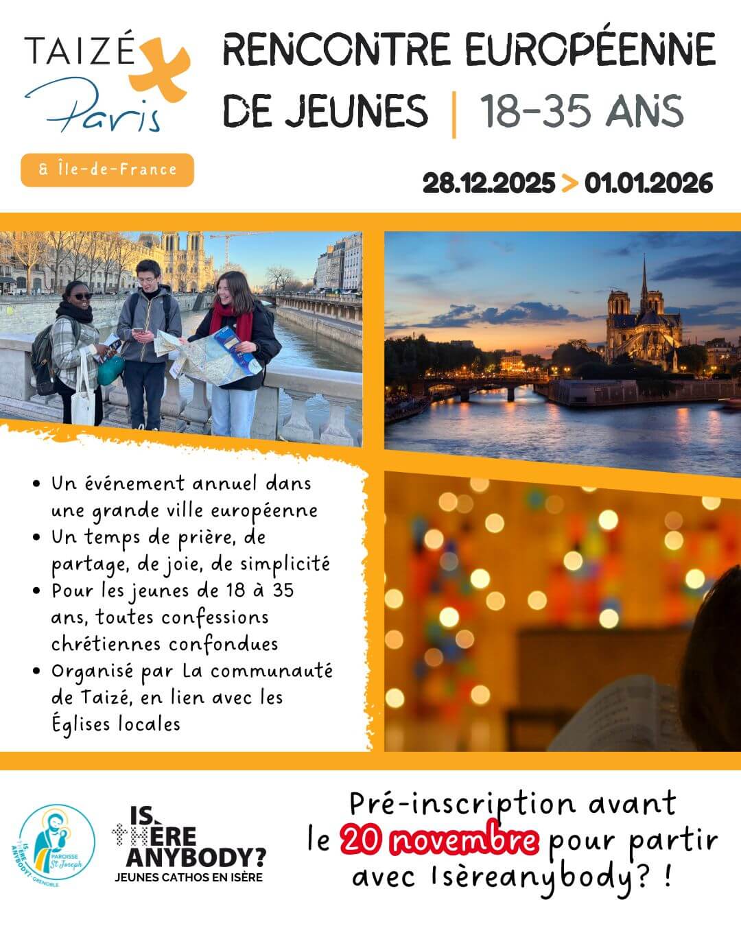 Pendant quelques jours, les jeunes vivent un temps de prière, de partage, de fraternité et de découverte spirituelle, dans un climat de simplicité et de joie. C’est une occasion unique de rencontrer d’autres jeunes chrétiens, de prier ensemble dans le style de Taizé (chants méditatifs, silence, écoute de la Parole) et de commencer la nouvelle année sous le signe de la paix et de l’espérance.